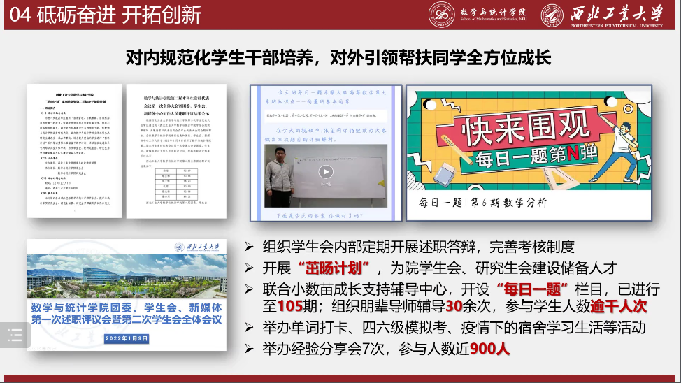 首先,由数学与统计学院主席团成员朱一帆介绍数学与统计学院学生会相关工作。朱一帆介绍了数学与统计学院学生会在思想政治引领及学生会内部改革方面的成果,阐述了新学期的四个工作重点:思想引领、权益服务、文体活动和宣传四个方面,。接着,朱一帆介绍了数统学院学生会工作的创新点,包括组织学生会内部定期开展述职答辩、开展“茁旸计划”、开设“每日一题”栏目、举办经验分享会、在传承旧有校级活动的同时开展创新文体活动等。