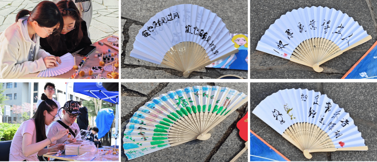 纸扇绘制区笔墨飘香,梅兰竹菊的清雅与校园地标剪影相映,一笔一画间,传统书画艺术与校园情怀深度交融;